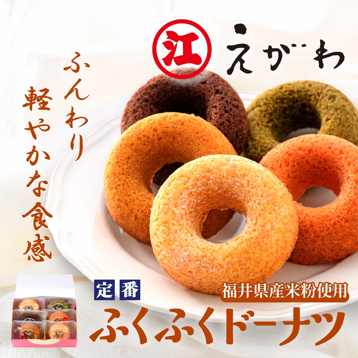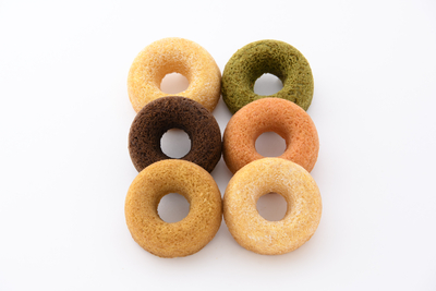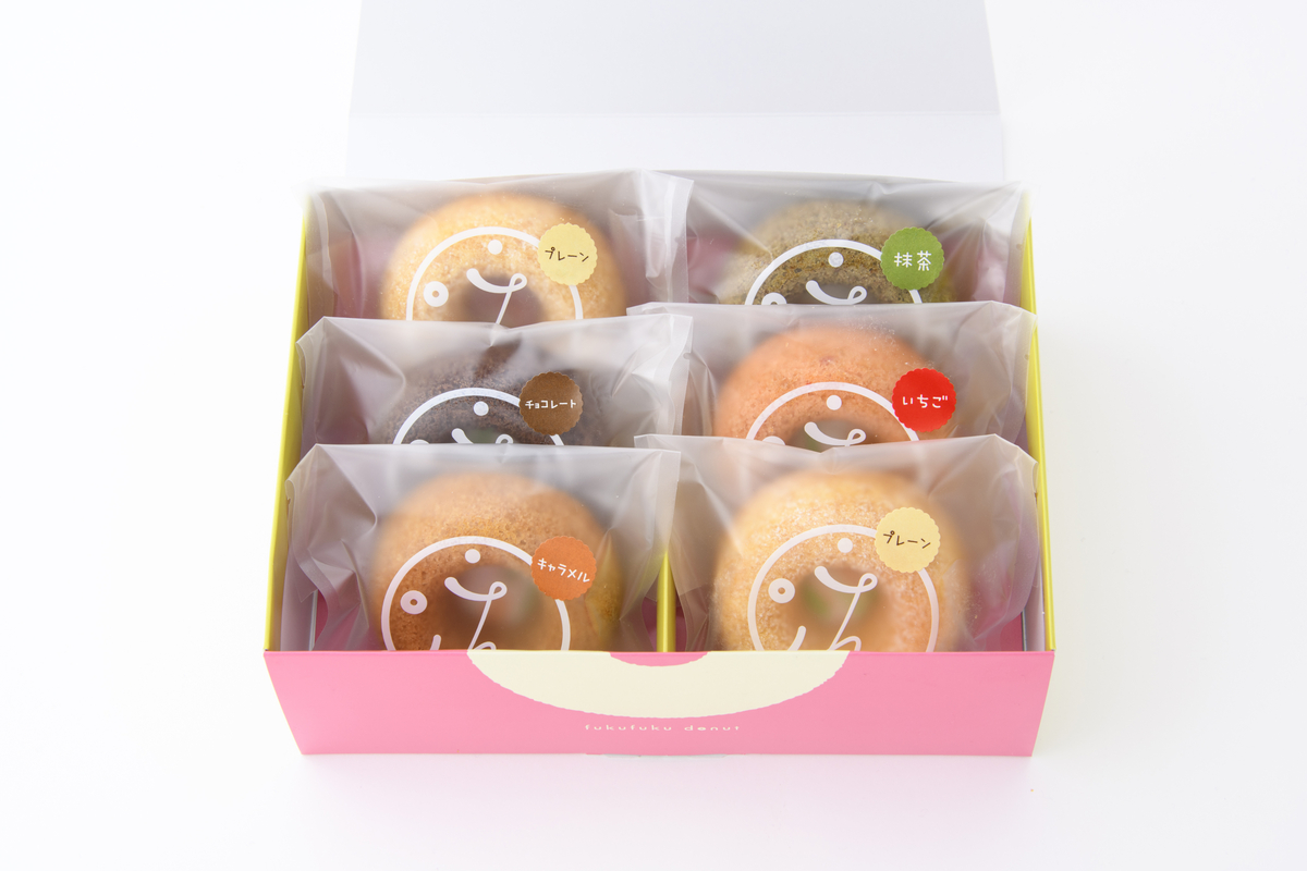 5種類のドーナツ(プレーン×2個、いちご・キャラメル・抹茶・チョコは各1個 計6個入り)